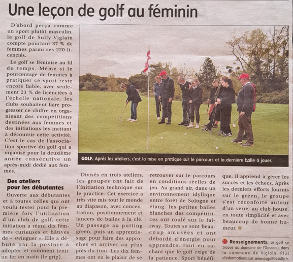 Suite à l'initiation golfique dispensée le samedi 19 octobre dernier auprès d'un public exclusivement féminin, la presse nous a rendu hommage à travers l'article de la république du centre que vous trouverez ci dessous.